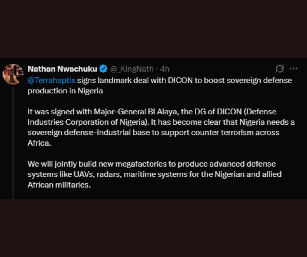 Nathan Nwachuku, the founder announced on X stating that the partnership provides a robust framework for the local production, assembly, research and development (R&D), and training in high-technology systems, including drones, cybersecurity solutions, robotics, and other ancillary software and hardware platforms.